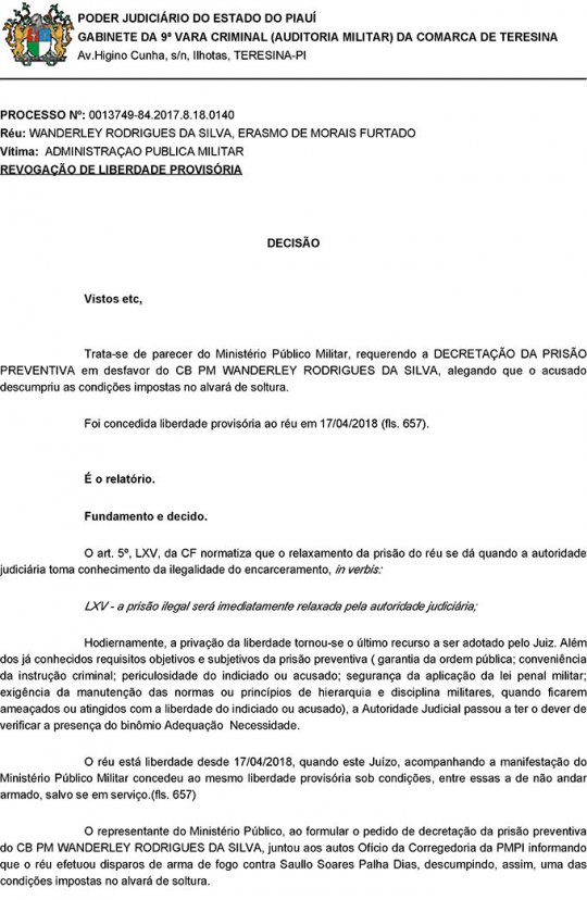 A juíza Waldenia Moura de Sá decretou a prisão preventiva do cabo da Polícia Militar Wanderley Rodrigues da Silva, o R. Silva, que se envolveu na briga com o cantor Saulo Dugado, na panificadora Ideal, na útlima quinta-feira (17), na zona leste de Teresina.