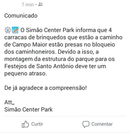 Em nota nas redes sociais, o Simão Center Park informou o atraso da chegada de quatro carretas com os brinquedos que estão a caminho de Campo Maior, mas ficaram presas em uma das manifestações nas rodovias estaduais e federais. Por conta disso, haverá um atraso na montagem e início da operação dos brinquedos para os festejos de junho.