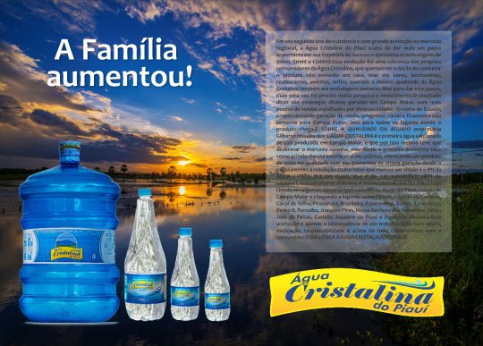 A Água Cristalina do Piauí, a primeira água adicionada de sais de Campo Maior, acaba de dar mais um importante passo em seu segundo ano de trajetória e aceitação na região norte do Piauí: chegaram as novas embalagens de 310ml, 510ml e 1.500ml. A evolução foi um atendimento às solicitações de amigos e clientes, que admiram e reconhecem a qualidade da Água Cristalina do Piauí.