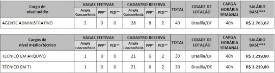 Foi publicado em 29 de maio, o edital do Concurso CFBIO (Conselho Federal de Biologia), que oferta 100 vagas (efetivas e cadastro reserva) para os cargos de Agente Administrativo, Técnico em Arquivo e Técnico em T.I.