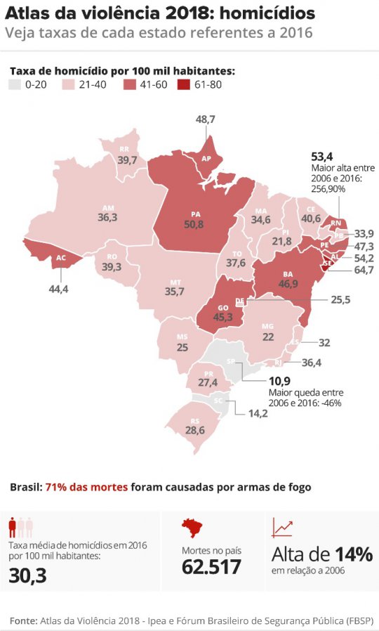 O Atlas da Violência é produzido pelo Fórum Brasileiro de Segurança Pública em parceria com o Instituto de Pesquisa Econômica Aplicada (Ipea), com dados do Ministério da Saúde.