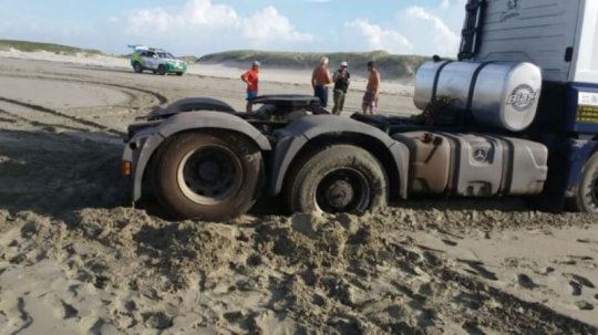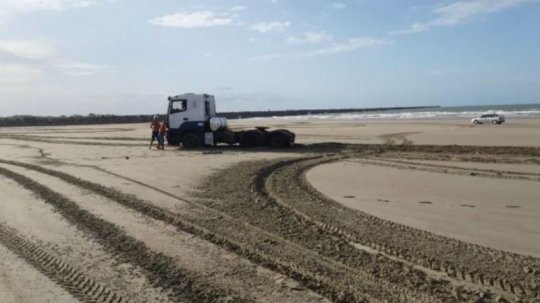 Um caminhão modelo M.BENZ 2540 - com placas de São Paulo - ficou atolado na orla da praia de Atalaia em Luís Correia na tarde de sábado (16/06), sendo retirado da areia com ajuda de um trator por volta das 23hs 40.
