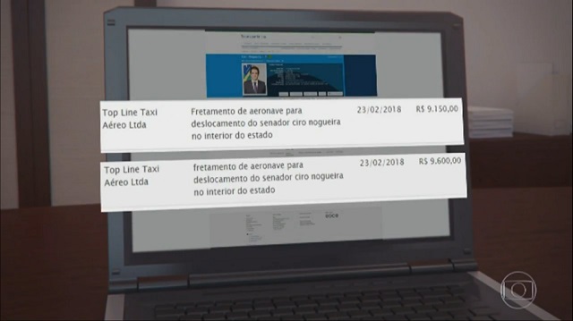 A reportagem da Rede Globo mostra que o gabinete do senador Ciro Nogueira prestou contas de alugueis de aeronaves de uma empresa de Taxi Aéreo, que funciona no aeroporto de Teresina. A data da utilização dos jatinhos por Ciro Nogueira, viajando o interior do Piauí é de 23 de fevereiro deste ano. A data coincide com a mesma que o senador Piauí estava em Lisboa, capital de Portugal. Foram publicadas até fotos do senador em Portugal nas redes sociais. Foram duas locações de aeronaves no valor superior a 18 mil reais.