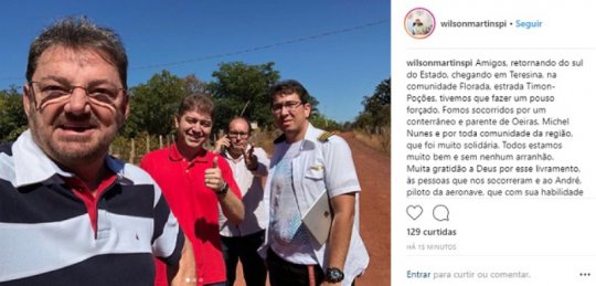 “Fomos socorridos por um conterrâneo e parente de Oeiras, Michel Nunes e por toda comunidade da região, que foi muito solidária. Todos estamos muito bem e sem nenhum arranhão. Muita gratidão a Deus por esse livramento, às pessoas que nos socorreram e ao André, piloto da aeronave, que com sua habilidade e perícia pousou o avião evitando o pior”, disse Wilson Martins.