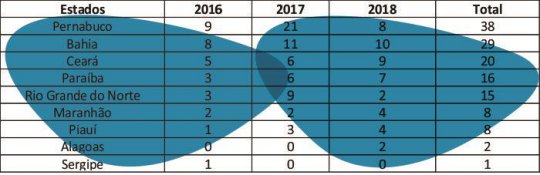 O Estado de Pernambuco lidera os números com 38 casos nos três anos, 21 deles em 2017. A Bahia vem em segundo lugar com 29 casos nos três anos, 10 deles nos 7 primeiros meses de 2018. Ceará, Paraíba e Rio Grande do Norte vem em seguida. O Piauí registrou 8 ataques, sendo quatro somente em 2018.