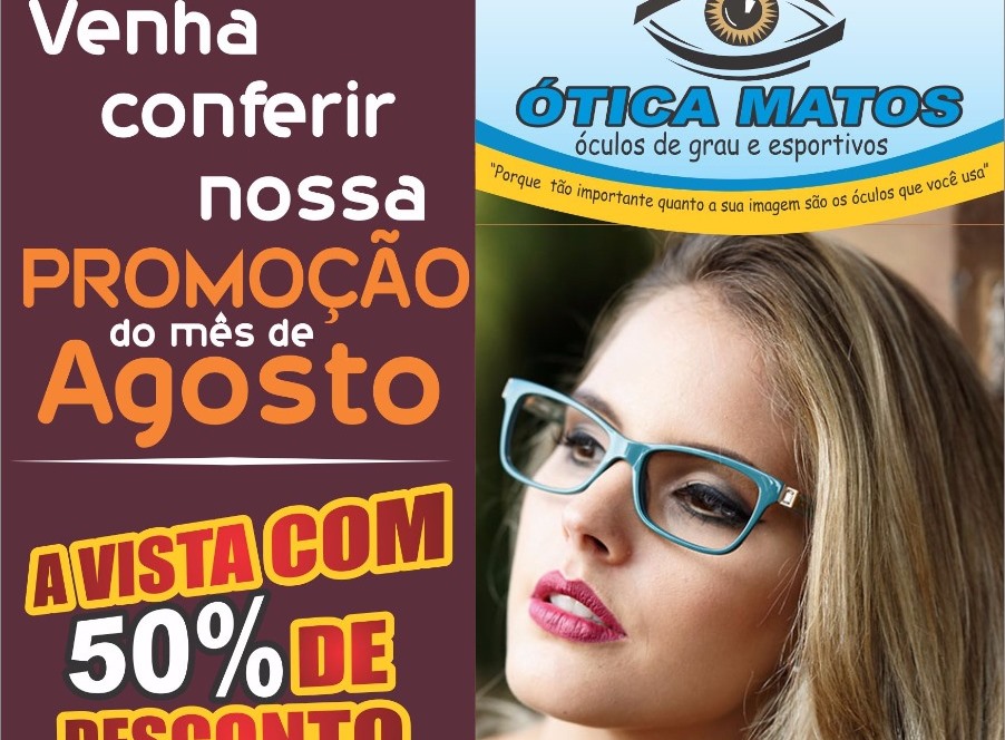 Tem promoção incrível para o mês de agosto: na compra do seu óculos completo, à vista, a armação fica pela metade do preço. Isso mesmo! O cliente tem 50% de desconto no valor da armação e mais o desconto de 10% na compra da lente.