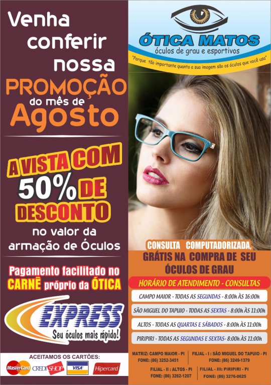 A Ótica Matos está presente em Campo Maior, São Miguel do Tapuio, Altos e Piripiri.
