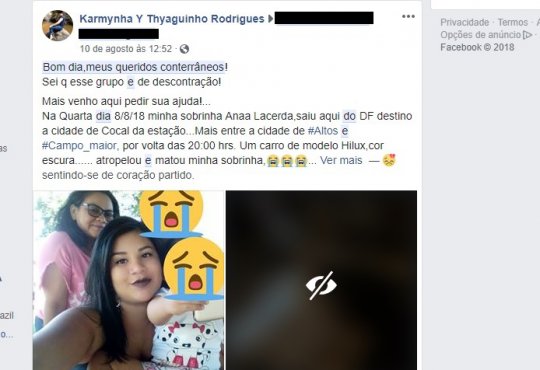 "E nem se quer prestou socorro e ainda fugiu do local. Por isso peço a colaboração que nos ajude a identificá-lo. Desde já agradeço a todos pela colaboração. Ajude-nos. Nossa dor pela perca é muito grande" diz a publicação.