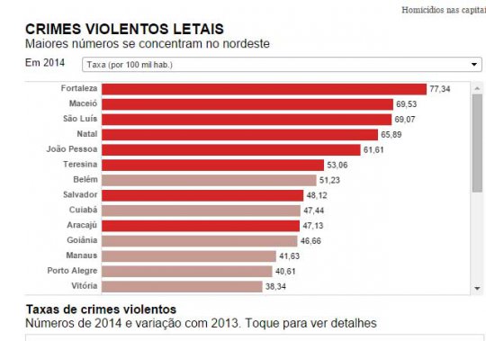 A reportagem destaca que os piores casos estão no Nordeste e a cada meia hora uma pessoa foi assassinada em capitais brasileiras no ano passado. Sendo 15.932 mortos violentamente, representando uma alta de 0,8% em relação a 2013.