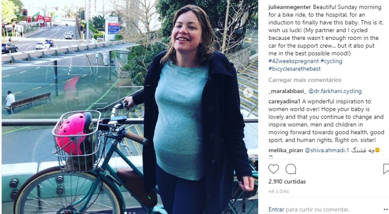 Julie Anne Genter, de 38 anos, disse que decidiu pedalar para realizar um parto induzido porque "não havia espaço suficiente no carro". Ela estava grávida de 42 semanas. A caminho do hospital, postou três fotos em sua conta no Instagram ao lado de uma bicicleta elétrica e afirmou que era uma "linda manhã de domingo para pedalar”.