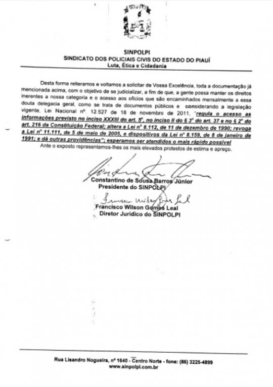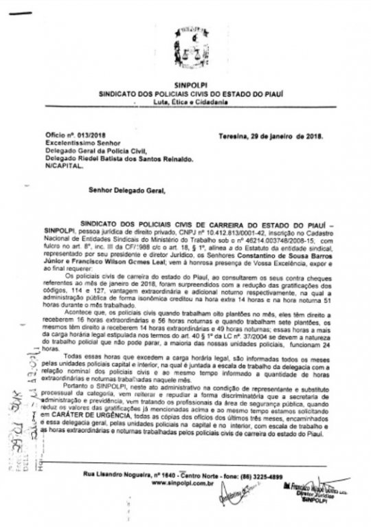 “Isso é um ato administrativo ilegal e imoral, o governo do Estado não pode mexer nessas gratificações, o sindicato repudia veementemente essa posição do governo, que há anos vem sucateando a segurança pública do Piauí, deixando de investir em estrutura e cortando gratificações e salários dos policiais civis”, alegou o presidente.