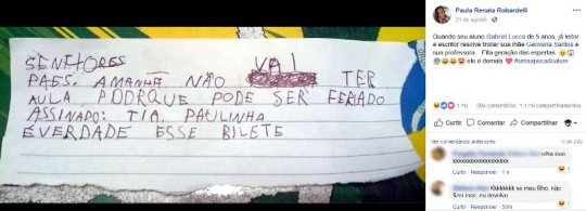 "A Geovana me mandou mensagem e eu só conseguia rir. O Gabriel é um figura! Resolvi postar no Facebook e, em apenas um dia, já tinha muitos comentários e publicações", conta a professora.