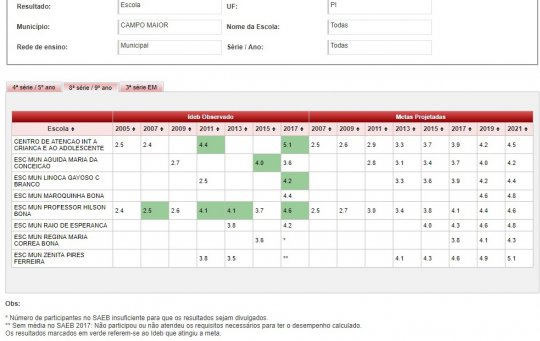 OS NÚEMROS DE CAMPO MAIOR: Na 4ª série / 5º ano, o Ideb observado nas escolas municipais, em média geral, foi 5.2 de uma projeção de 4.4 para 2017; Já na 8ª série / 9º ano, o Ideb Observado foi 4.7 de uma projeção de 4.1 estipulada para 2017 pelo MEC.
