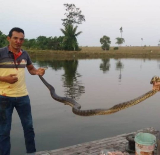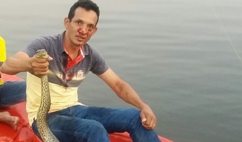 Um empresário foi atacado no rosto por uma sucuri durante uma pescaria no final de semana em uma propriedade rural de Juara, a 690 km de Cuiabá. Moisés Rodrigues estava com amigos em uma represa e se preparava para amarrar o barco quando foi surpreendido pelo animal.