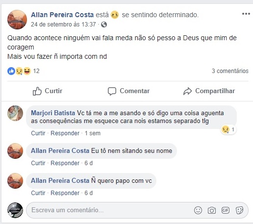 O delegado comentou ainda que há menos de uma semana, em uma rede social, Allan Pereira escreveu uma postagem que Marjori comentou, questionando o ex-companheiro se a mensagem representava uma ameaça para ela. Na mesma postagem, o rapaz negou.