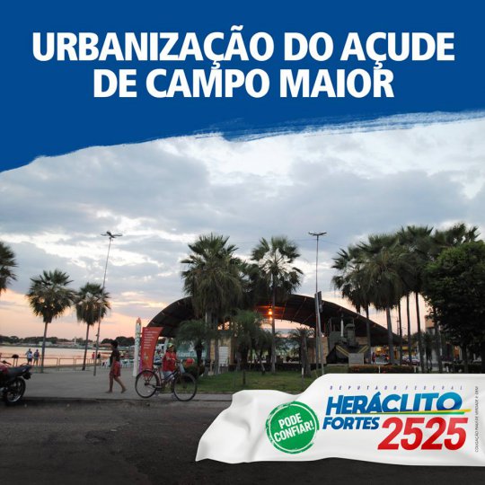 "Outra prioridade minha para o próximo mandato é a urbanização do Açude de Campo Maior. Um lugar com tanto potencial merece ser espaço destinado ao lazer e ao turismo. Campo Maior já viu, através da criação do Complexo Cultural Valdir Fortes, da revitalização da praça Bona Primo, da reforma do mercado central e de tantas outras obras que lutei para realizar..]" dizia texto junto ao banner acima.