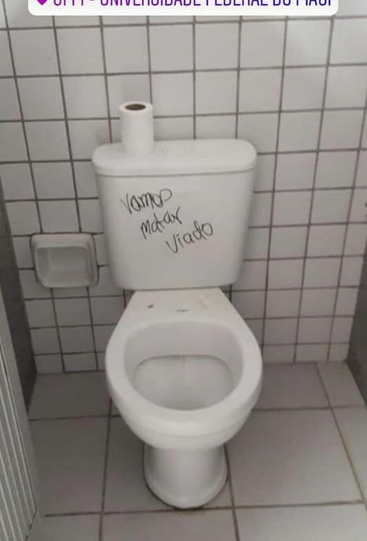 Em um dos banheiros do Centro de Ciências Agrárias (CCA), um vaso foi escrito: “Vamos matar viado”. Alunos tiraram fotos e a imagem rapidamente viralizou nas redes sociais. Segundo a assessoria da instituição, a foto é real e a ameaça homofóbica realmente ocorreu.
