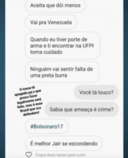 A jovem entrou em seu perfil no Instagram e se deparou com várias ameaças. "Aceita que dói menos. Vai para Venezuela. Quando eu tiver porte de arma e ti encontrar na UFPI, toma cuidado. Ninguém vai sentir falta de uma preta burra", diz o início da mensagem. Ela, então, responde. "Você está louco? Sabia que ameaça é crime?". Nesse momento, o agressor, que não foi identificado, escreve "#Bolsonaro17. É melhor Jair se escondendo".
