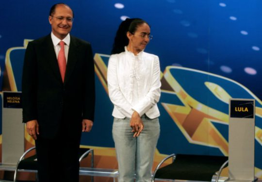 Ao lado de Alckmin, Heloisa Helena observa cadeira vazia de Lula em debate em 2006.