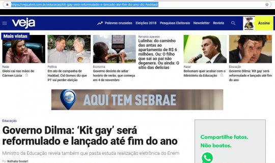 A polêmica sobre uma possível criação de um “kit gay” continua rendendo. Jair Bolsonaro, candidato a presidência pelo PSL, atribui o kit ao então Ministro da Educação Fernando Haddad, informação contestada pelos organizadores do material que faria parte de um projeto do governo federal chamada "o Brasil sem Homofobia".