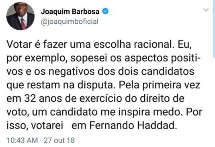 Ex-Presidente do Supremo Tribunal Federal, Joaquim Barbosa, que foi relator do Mensalão, declarou por Twitter que votará em Fernando Haddad (PT) nas eleições do próximo domingo (28).