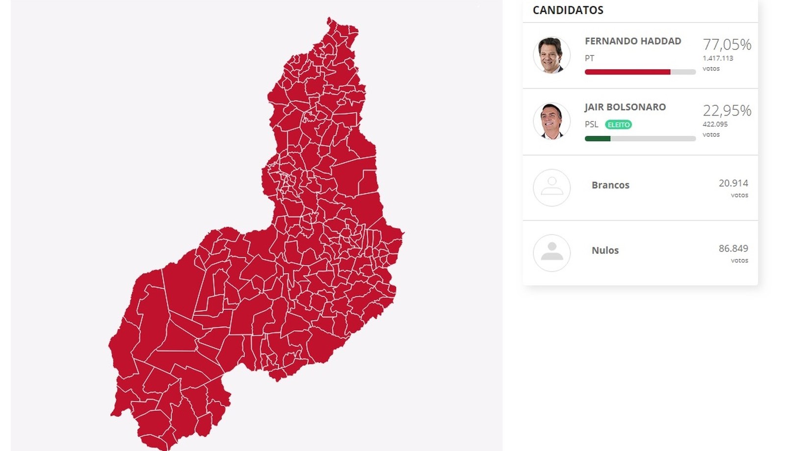 Fernando Haddad venceu em todas as 224 cidades do Piauí, assim como aconteceu nos estados do Sergipe e Ceará. O resultado foi semelhante ao primeiro turno, quando o candidato do PT obteve maioria dos votos em todos os municípios do estado.