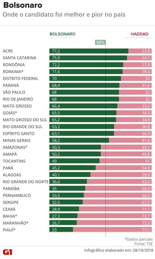 O estado em que Bolsonaro mais avançou em relação ao primeiro turno foi São Paulo, onde seu percentual de votos saltou de 53% em 7 de outubro para 68% neste domingo (28).