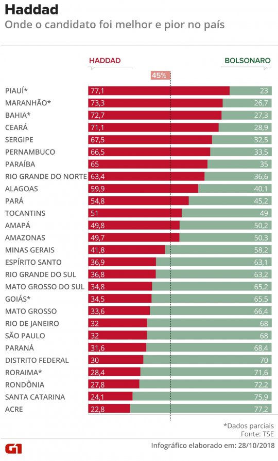 Haddad, por sua vez, teve o maior avanço no Ceará, que, no 1º turno, havia dado 33% para Haddad. No segundo turno – sem a presença de Ciro Gomes, que havia vencido no estado – o petista obteve 71,1%.