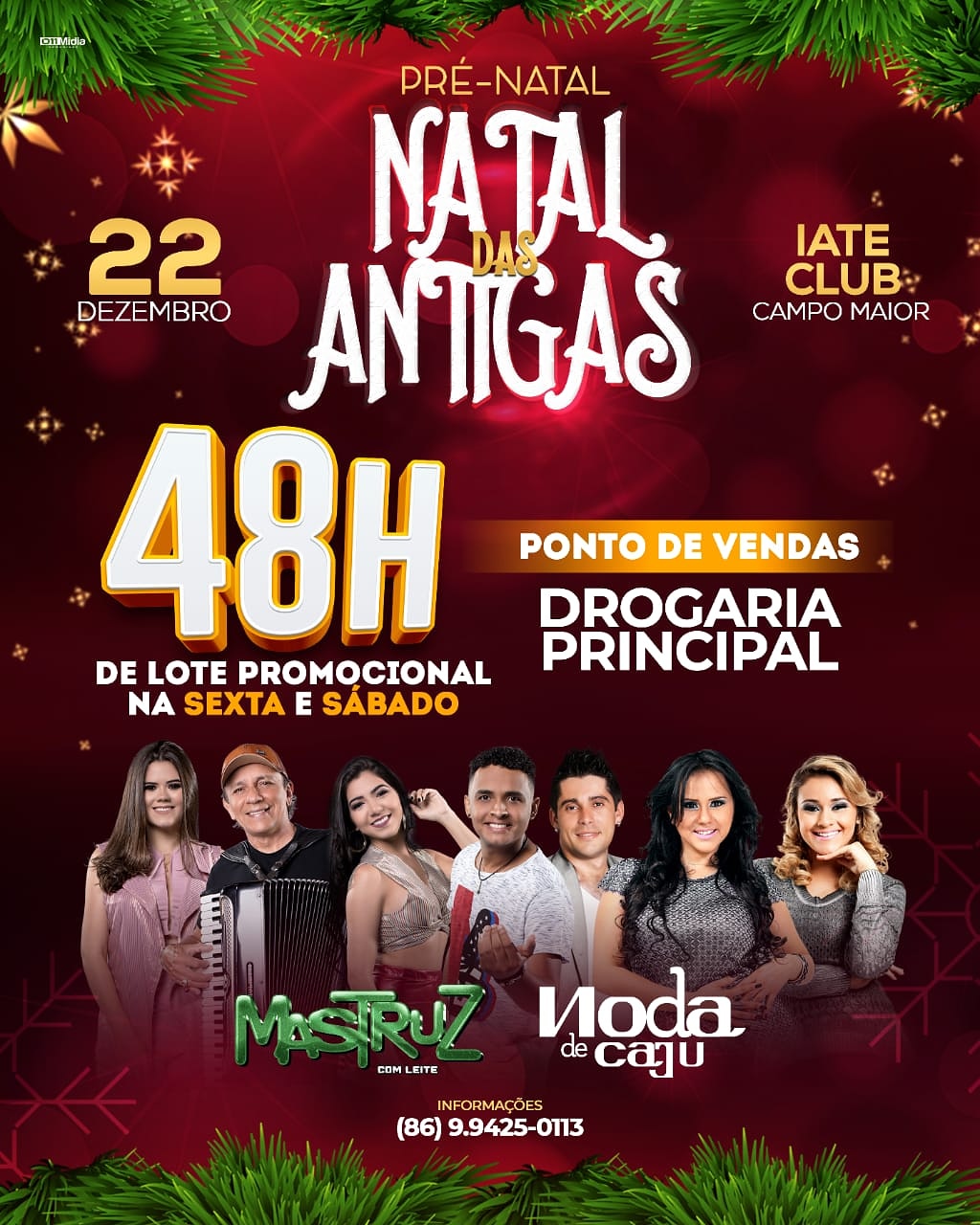 No sábado, 22 de dezembro, o Iate Clube de Campo Maior vai receber um grande show com as bandas Noda de Caju e Mastruz com Leite no palco do pré-natal das antigas.