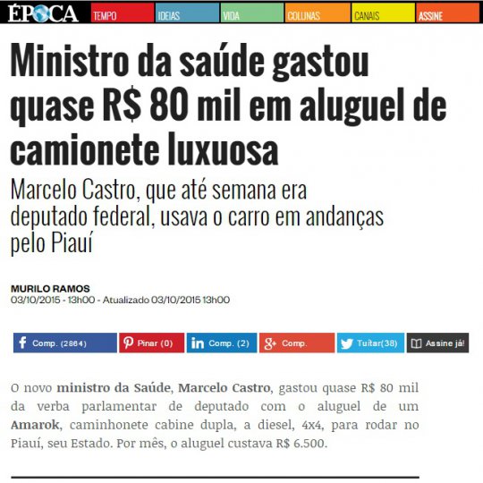 A coluna Expresso da Revista Época publicou neste sábado (3) uma nota denunciando que o Ministro da Saúde, o piauiense Marcelo Castro, gastou R$ 80 mil com o aluguel de uma caminhonete luxuosa.