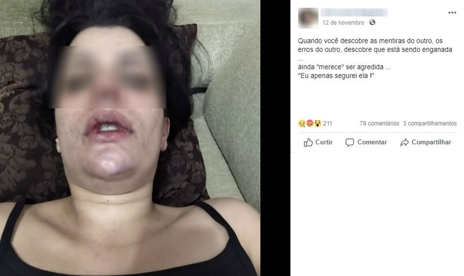 A foto de Ana Laura Nogueira da Cruz com o rosto inchado rendeu vários comentários de apoio e levou outras pessoas a compartilharem o caso. Na legenda, ela escreveu: "Quando você descobre as mentiras do outro, os erros do outro, você descobre que está sendo enganada...ainda 'merece' ser agredida...'Eu apenas segurei ela!'."