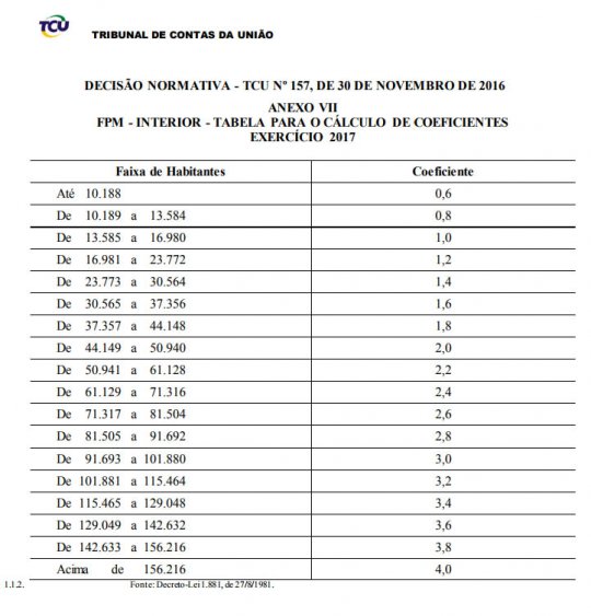 Veja abaixo a normativa de cálculo de distribuição de FPM e os repasses desta terça-feira