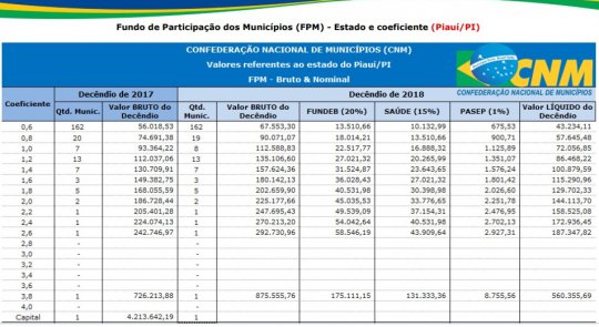 O repasse aos Municípios foi de quase R$ 758 milhões, já descontada a retenção do Fundo de Manutenção e Desenvolvimento da Educação Básica e de Valorização dos Profissionais da Educação (Fundeb). Em valores brutos, incluindo o Fundeb, o montante é de mais de R$ 947 milhões. 162 município sdo piauí com coeficiente 0.6, como Jatobá do Piauí, Boa Hora, Cabeceiras, Cocal de Telha, Boqueirão e outros, receberam R$ 67.553,30. Campo Maior que é coeficente 2.0 recebeu R$ 225.177,66.