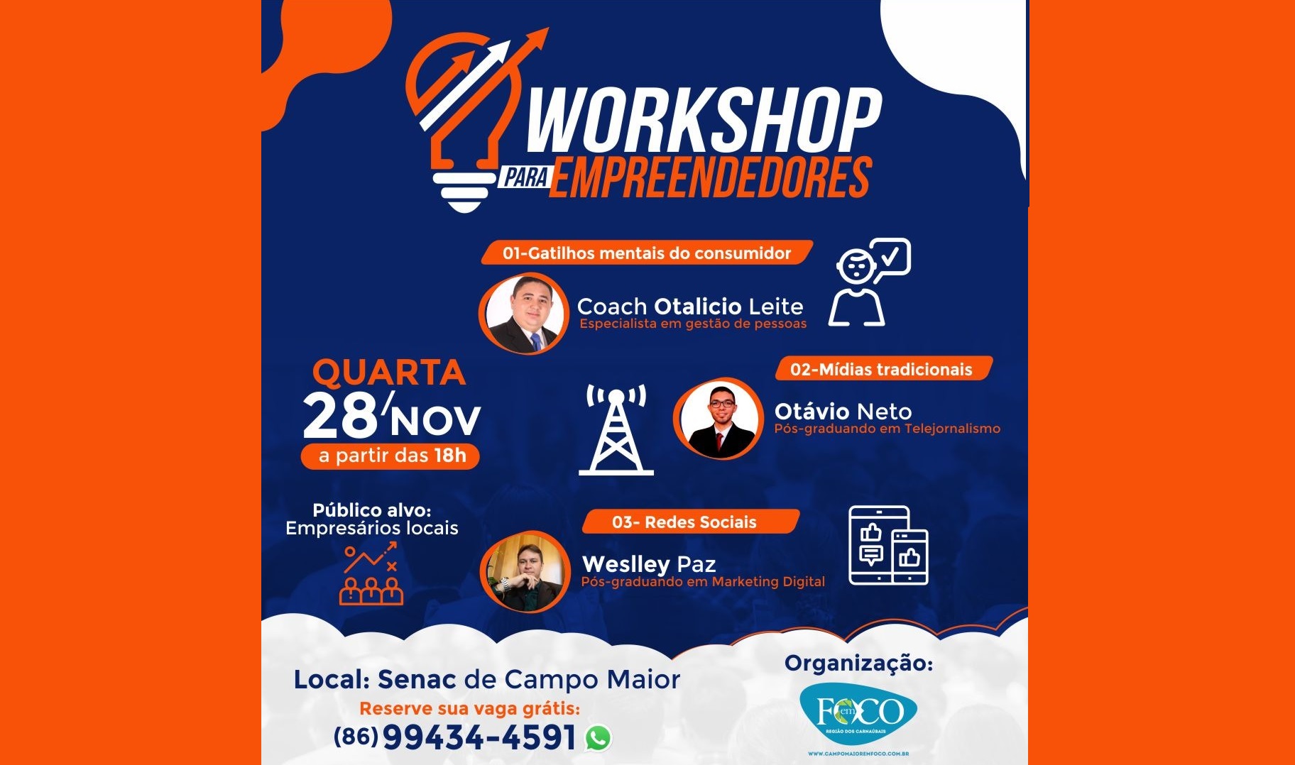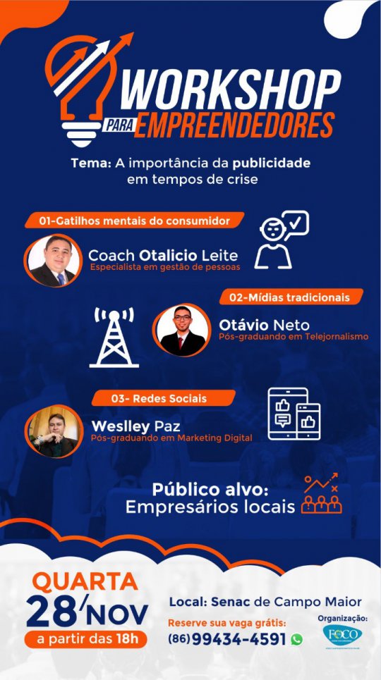 O workshop terá duração de aproximadamente 2h e será dividido em três momentos. No primeiro momento o Master Coach Otalício Leite, especialista em Gestão de Pessoas, apresentará uma palestra sobre “Gatilhos Mentais do Consumidor”, no segundo momento o pós-graduando em Telejornalismo, Otávio Neto falará sobre o “Uso de Mídias Tradicionais” e o pós-graduando em Marketing Digital, Weslley Paz encerrará o evento falando sobre o “Uso de Redes Sociais”.