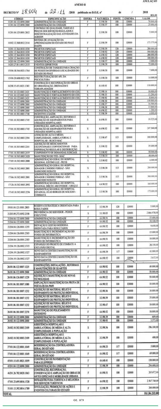 Desde valor, por exemplo, RS 4,8 milhões serão rateados entre a Assembleia Legislativa do Estado do Piauí (ALEPI) e o Tribunal de Justiça do Piauí (TJPI). Os recursos foram anulados, por exemplo, da área da saúde, de hospitais regionais, como das cidades de Picos, São Raimundo Nonato, Uruçuí e Curimatá.