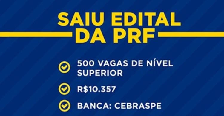 A Polícia Rodoviária Federal (PRF) divulgou, nesta quarta-feira (28/11), o edital de um concurso público com 500 vagas de emprego. As oportunidades são para o cargo de Policial Rodoviário Federal, Padrão I da Terceira Classe. Podem se inscrever aqueles que tenham diploma registrado em qualquer curso de graduação de nível superior.