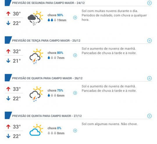 A segunda (24) começou com 23° C. A temperatura evolui até 30°C no período da tarde e volta a cair no início da noite. A probabilidade de chuva é de 90%. No dia de Natal, os termômetros começam com 21°C, sobem para 32°C no período da tarde e voltam a despencar à noite. A possibilidade de a chuva cair entre 10h e 20h é de 80%.