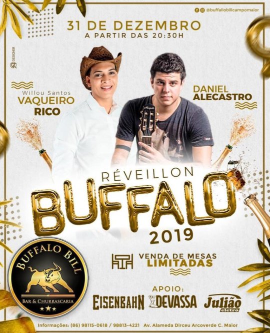 Já no Buffalo Bill, duas atrações realizam a festa de virada de ano a partir das 20:30. Se apresentam Willton Santos: Vaqueiro Rico e Daniel Alecantro. A venda de mesas é limitada pelo contato (86) 98115 0618.