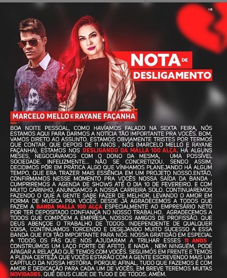 Durante os últimos dias algumas pessoas já falavam sobre a saída dos vocalistas Rayane Façanha e Marcelo Mello da banda Malla 100 Alça, mas nada havia sido confirmado nem pelo tradicional grupo forrozeiro e nem pelos cantores, mas na noite desta segunda-feira (07), através das redes sociais, eles anunciaram o desligamento.
