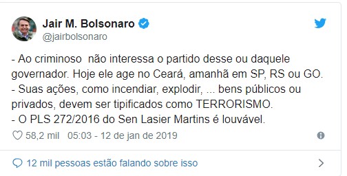 O presidente Jair Bolsonaro defendeu hoje (12) que ações criminosas ocorridas no Ceará sejam consideradas terrorismo. A manifestação do presidente em favor do PLS 272/2016 foi feita por meio de sua conta pessoal no Twitter, às 7h deste sábado (12), ao comentar situação no Ceará.