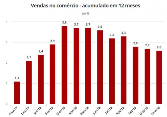 Em relação a novembro de 2017, as vendas cresceram 4,4%. No acumulado até novembro, a alta é de 2,5%, enquanto nos últimos 12 meses é de 2,6%.