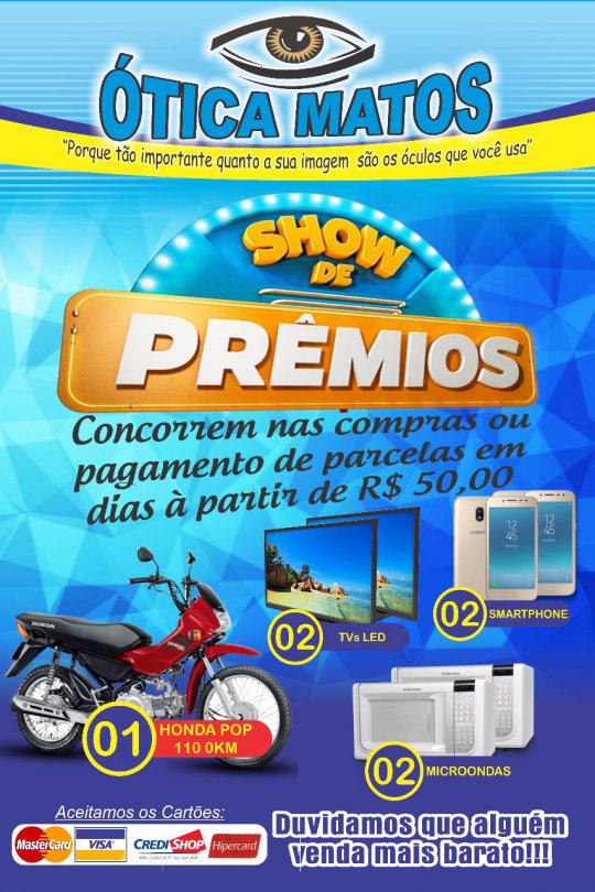 A Rede de Loja “Óticas Matos” começa 2019 com mais um show de prêmios aos seus clientes. 1 Honda pop, 2 TVs de LED, 2 smartphones, e 2 microondas. O cliente concorre aos prêmios comprando ou pagamento mensalidades em dias, a partir de R$ 50,00. O sorteio acontece nesse sábado, dia 19 na matriz de Campo Maior.