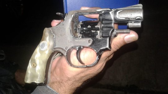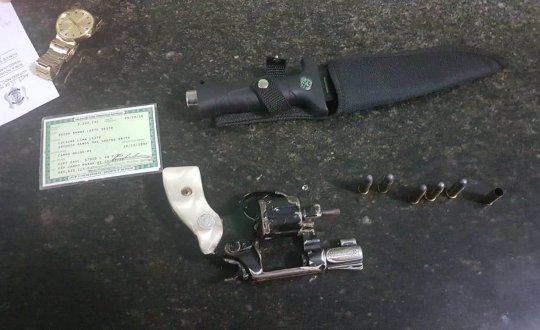 A polícia apreendeu a arma, um revólver calibre 32, com 6 munições, uma delas deflagrada, além de uma arma branca, um punhal.