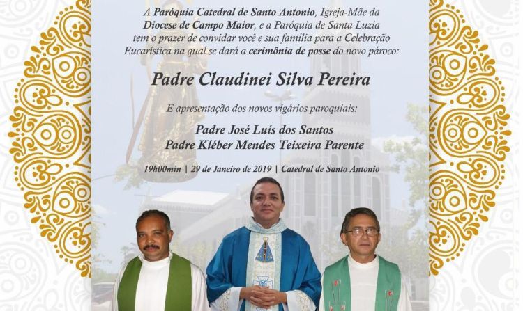 A Paróquia Catedral de Santo Antônio em Campo Maior-PI marcou para o próximo dia 29 de janeiro a cerimonia de posse do Padre Claudinei Silva Pereira como novo Pároco da Paróquia. Ele substitui o Padre Monsenhor Paulo Mateus que vai assumir a Paróquia de Nossa Senhora do Rosário em José de Freitas-PI.