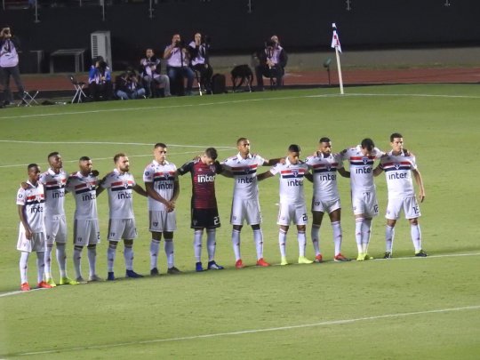 Única coisa boa que o time fez no jogo: um minuto de silêncio pelo incêndio no Ninho do Urubu que matou dez pessoas. Jogadores do São Paulo se alinharam no centro do campo