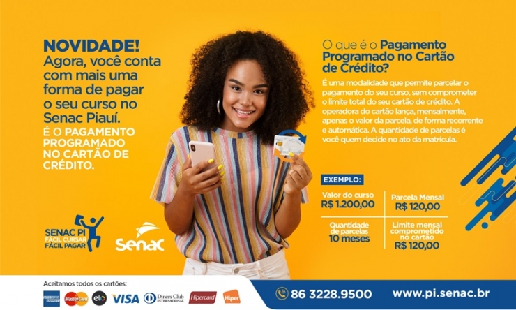 O Senac Piauí quer facilitar ainda mais o seu investimento em qualificação. Pensando nisso, lançou mais uma forma de pagamento e o que já era fácil pagar, agora ficou melhor ainda! O pagamento programado no cartão de crédito ou crédito recorrente é fácil, prático e permite planejar mensalmente as despesas sem comprometer as finanças.