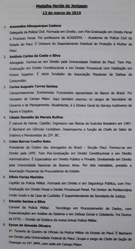 Já a prefeitura de Campo Maior entregou a Medalha Heróis do Jenipapo a 27 pessoas. A honraria foi criada em 1983 e entregue a pessoas e entidades que se façam dignas de serem homenageadas pelo município de Campo Maior.