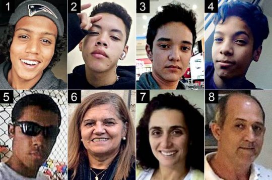 AS VÍTIMAS - Os estudantes Douglas Murilo Celestino, de 16 anos (1), Caio Oliveira, de 15 anos (2), Samuel Melquíades, de 16 anos (3), Kaio Lucas da Costa Limeira, de 15 anos (4), e Cleiton Antonio Ribeiro, de 17 anos (5); as funcionárias Marilena Ferreira Vieira Umezu, de 59 anos (6), e Eliana Regina de Oliveira Xavier, de 38 anos (7); e o empresário Jorge Antônio de Moraes, de 51 anos (8): todos assassinados a tiros de revólver calibre 38.