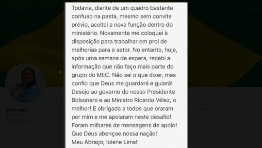 “Diante de um quadro bastante confuso na pasta, mesmo sem convite prévio, aceitei a nova função dentro do ministério. Novamente me coloquei à disposição para trabalhar em prol de melhorias para o setor. No entanto, hoje, após uma semana de espera, recebi a informação que não faço mais parte do grupo do MEC”, postou ela, em sua conta no Twitter.