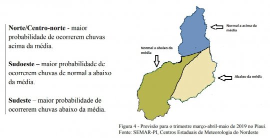 A Zona de Convergência Intertropical (ZCIT) de atividade moderada, entre 2°S e 5°N no Atlântico, forma áreas de instabilidades favoráveis às chuvas no Piauí. A região norte tem maior probabilidade de ocorrerem chuvas acima da média até o mês de maior, segundo o Boletim de Informações Climáticas para o estado do Piauí para o Trimestre mar-abr-mai/2019.